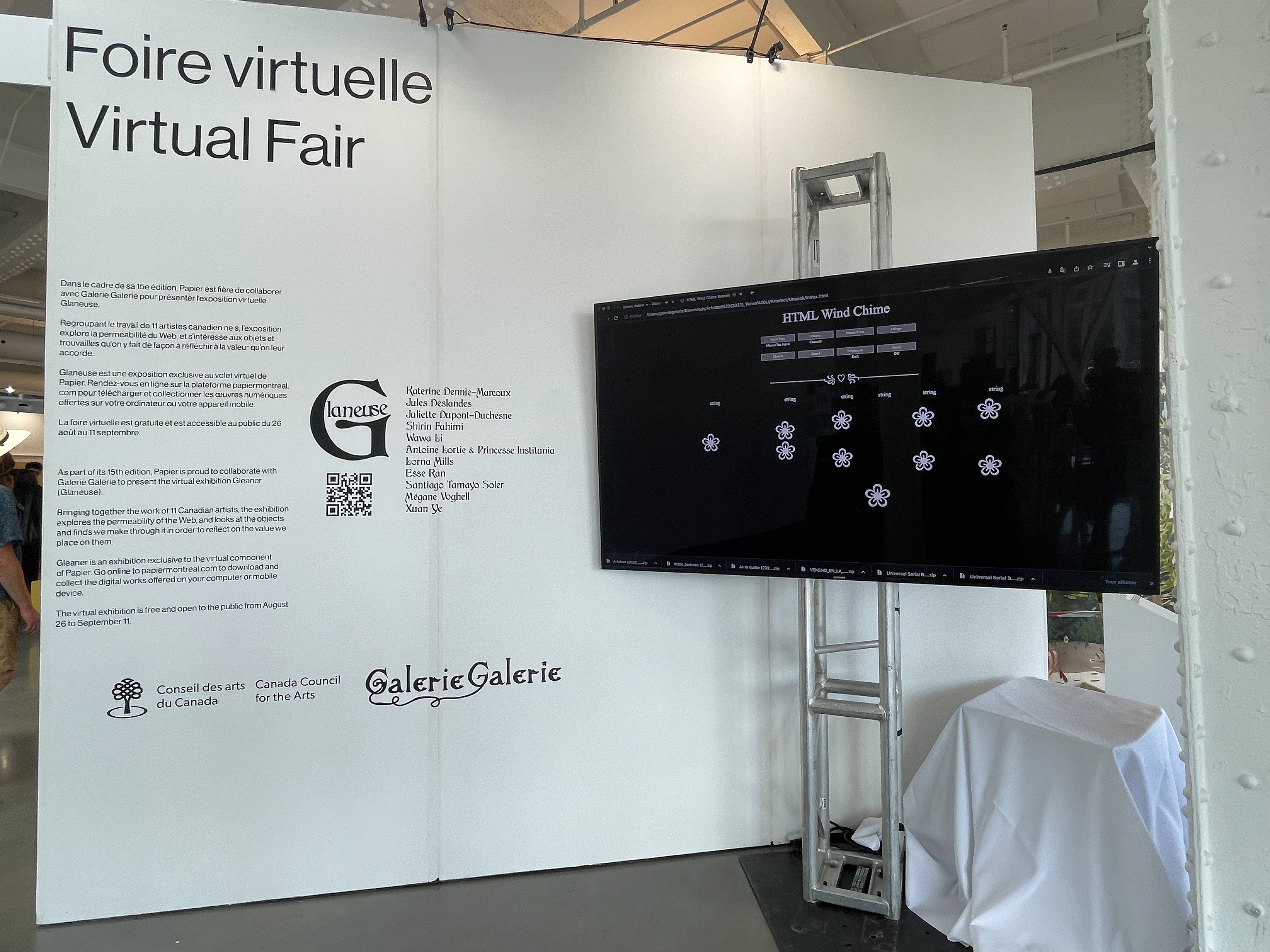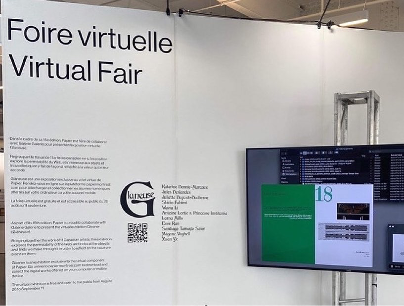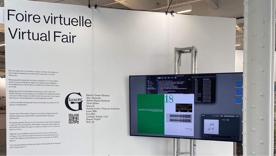 *Gleaner* (Glaneuse), a virtual exhibition bringing together the work of eleven Canadian artists. The pieces that compose it – screenshot, GIF, 3D, code, video, etc., are acquired by Galerie Galerie for the duration of the project to be offered free of charge to the public with the intention of limitless downloading. Immersed in a universe that is both abstract and familiar, the visitor can collect these files, transposing them into his own intimate digital spaces, until assembling his own collection. Gleaner (Glaneuse) explores the permeability of the Web and the objects and finds that we make on it, reflecting on the value that we attribute to them.